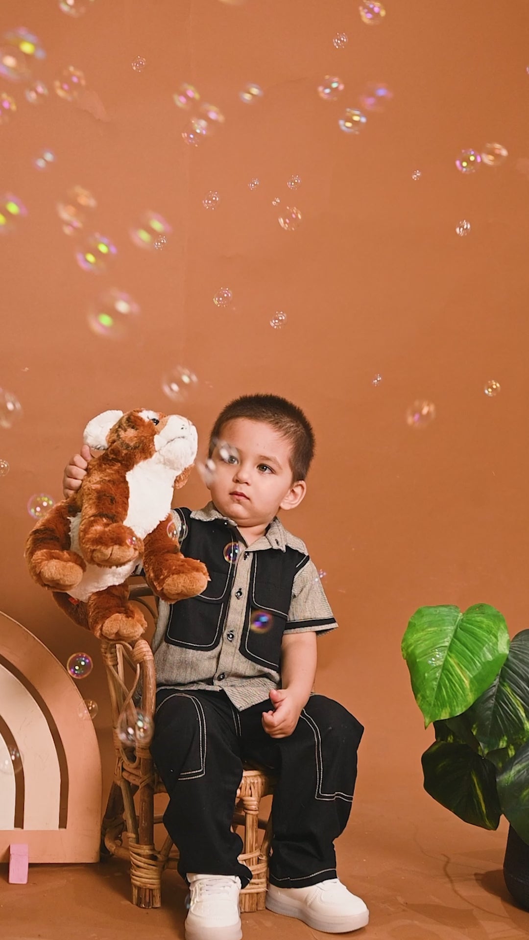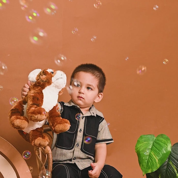 Elevate everyday dressing with this statement brown striped linen co-ord set. The abstract-style shirt features two oversized black front pockets that add a bold and functional twist to the minimalist silhouette. Paired with tailored black linen trousers, subtly adorned with cream anchor detailing, this ensemble combines structured comfort with standout style.