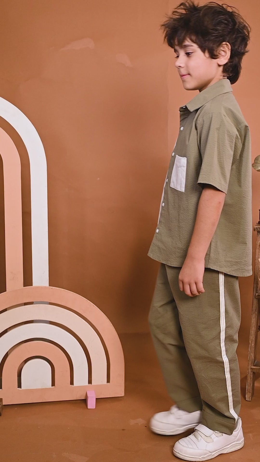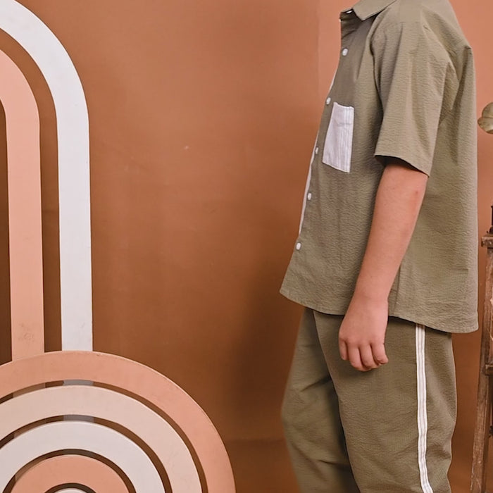 A stylishly relaxed co-ord set crafted in olive cotton, featuring a classic collared shirt with a unique half-and-half design. The shirt blends solid olive with olive stripes on a soothing white base, creating a bold yet balanced look. Paired with coordinated bottoms, this oversized silhouette brings together comfort, versatility, and contemporary flair—perfect for playdates or casual outings with a fashionable twist.