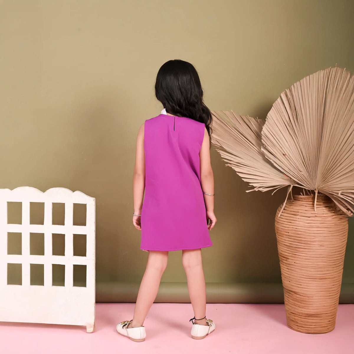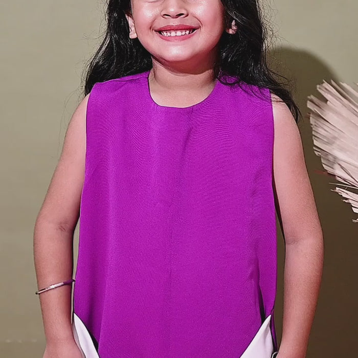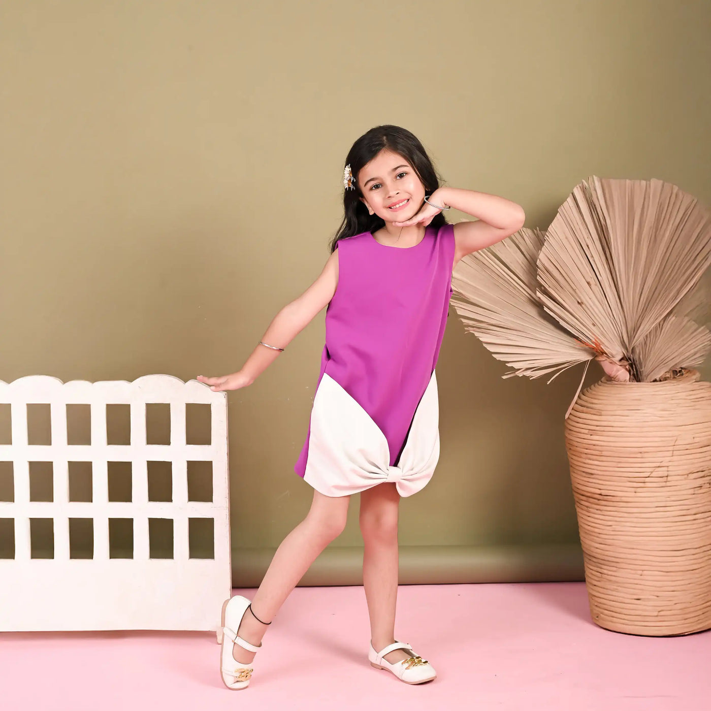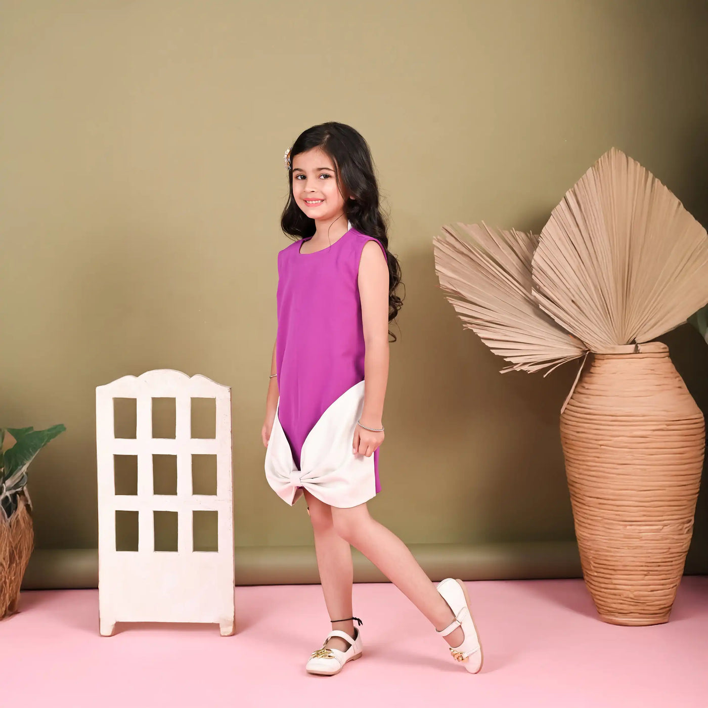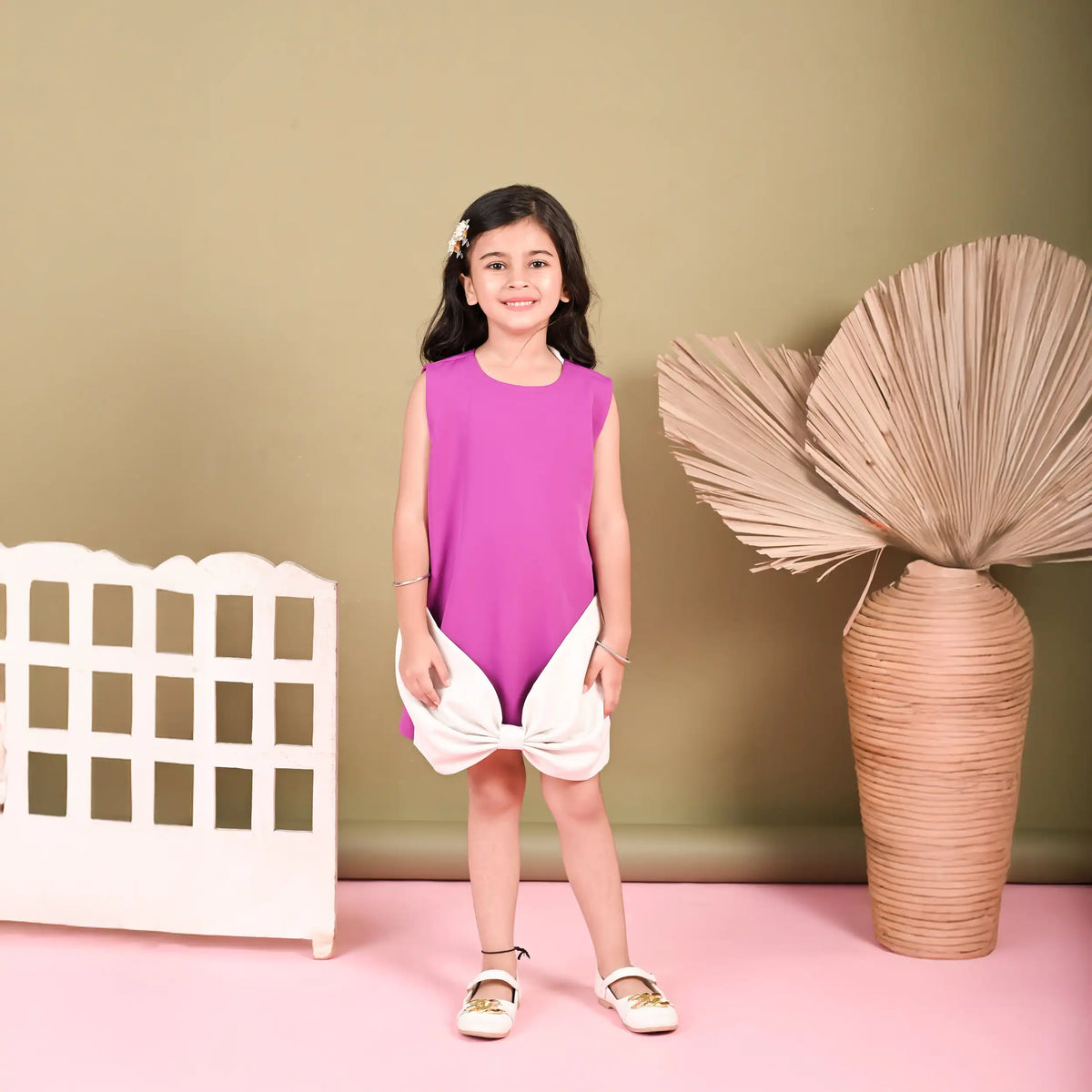 This charming sleeveless party dress is designed to bring a fresh, playful twist to your little girl’s wardrobe. Crafted in a rich banana crepe purple hue with a smooth finish, it features a relaxed straight fit for all-day comfort. The highlight of the dress is its contrasting ivory hem, styled with an oversized bow detail at the front, adding a touch of whimsy and elegance. Perfectly balancing chic style with youthful charm, this dress is ideal for birthdays, festive celebrations, or special outings. Pair it with dainty shoes and hair accessories to complete a standout look for your princess.